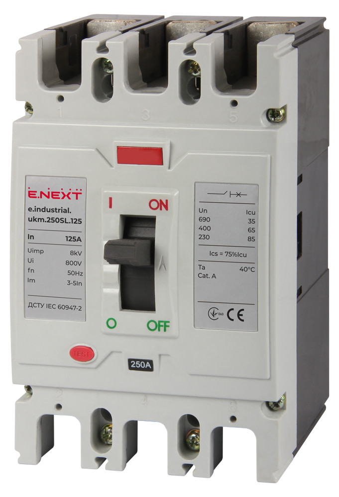 Силовий автоматичний вимикач e.industrial.ukm.250SL.125, 3р, 125А призначений для захисту електричних ланцюгів від тривалих перевантажень та струмів короткого замикання, а також для оперативного включення та відключення ділянок електричних ланцюгів змінного струму частотою 50 Гц напругою до 660 В.